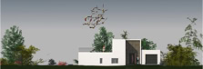 Une imbrication de volumes blancs et de parement TRESPA en ton bois grisé.